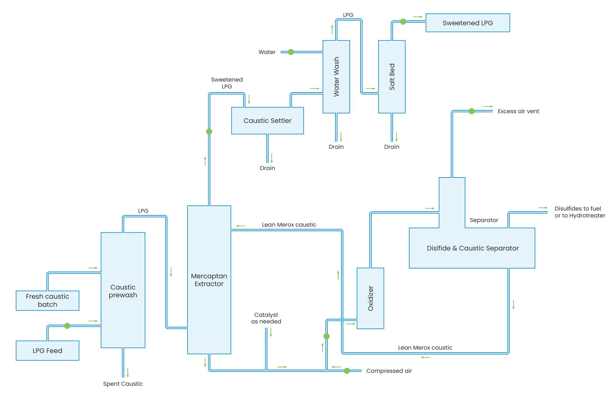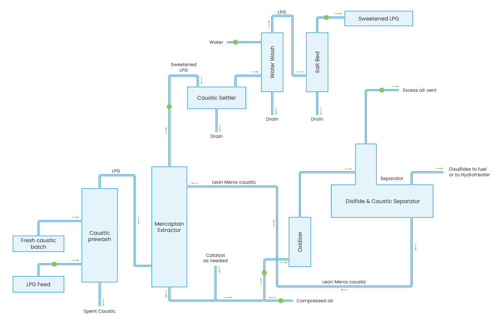 The Merox process is an efficient and economical catalytic process developed for the chemical treatment of petroleum fractions to remove sulfur present as mercaptans (Merox extraction) or to directly convert mercaptan sulfur to less objectionable disulfides (Merox sweetening). This process is used for liquid-phase treating of liquefied petroleum gases (LPG), natural-gas liquids (NGL), naphtha, gasolines, kerosene, jet fuels, and heating oils. It also can be used to sweeten natural gas, refinery gas, and synthetic gas in conjunction with conventional pretreatment and posttreatment processes.