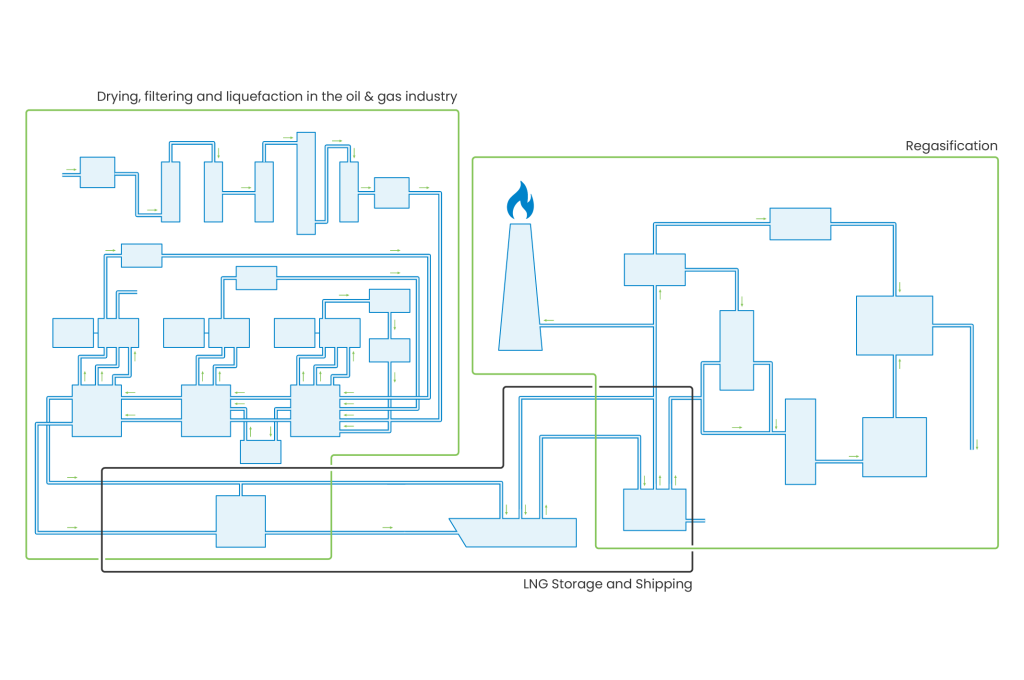 Natural gas is commonly transported over long distances through high-pressure transmission pipelines. When pipeline transport is not feasible due to technical, economic, or political constraints, the gas is transported by sea in the form of liquefied natural gas (LNG). To enable this, natural gas is cooled to approximately (–162 °C), at which point methane the primary component condenses into a liquid. Liquefaction reduces the gas volume by about 600 times, making long-distance storage and transportation significantly more efficient.