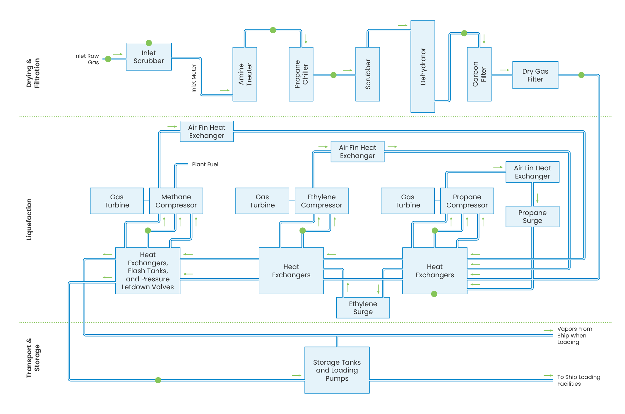 In the midstream LNG process, raw natural gas is first conditioned and purified to meet cryogenic operating requirements. Inlet separation and filtration remove free liquids, solids, and aerosols, while acid gas removal and dehydration systems eliminate CO₂, sulfur compounds, and moisture that could freeze or damage equipment at low temperatures. Final polishing filters ensure the gas meets stringent cleanliness specifications before entering the liquefaction section. Following purification, the treated gas undergoes multi-stage cooling and refrigeration, typically using propane, ethylene, or mixed refrigerant cycles. Heat exchangers progressively reduce the gas temperature while maintaining controlled pressure conditions. Compression stages provide the necessary energy to support refrigeration efficiency and stable process operation. The gas is ultimately cooled to cryogenic conditions, where it condenses into liquid LNG. This liquefaction step produces a stable, high-purity liquid suitable for downstream storage, transportation, and export, forming the critical transition point between gas treatment and LNG handling within the midstream value chain.