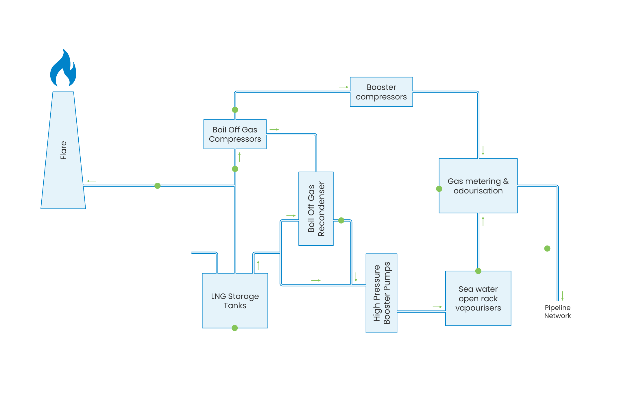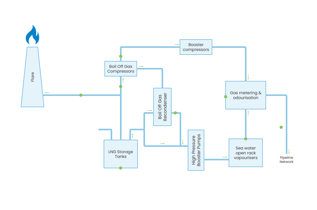 Liquefied natural gas is stored in cryogenic storage tanks designed to maintain extremely low temperatures and minimize heat ingress. During storage, a small portion of LNG naturally evaporates, forming boil-off gas (BOG). This vapour is collected and routed to boil-off gas compressors, where it is compressed and either sent to a recondenser to be converted back into liquid LNG or directed for use as fuel or safe disposal via the flare system. LNG required for pipeline delivery is withdrawn from the storage tanks and pressurized using high-pressure booster pumps before entering vaporizers, where it is heated typically using seawater or ambient heat and converted back into gaseous form. The regasified natural gas is then conditioned and sent to the gas metering and odorisation system, ensuring accurate custody transfer measurement and compliance with distribution requirements.