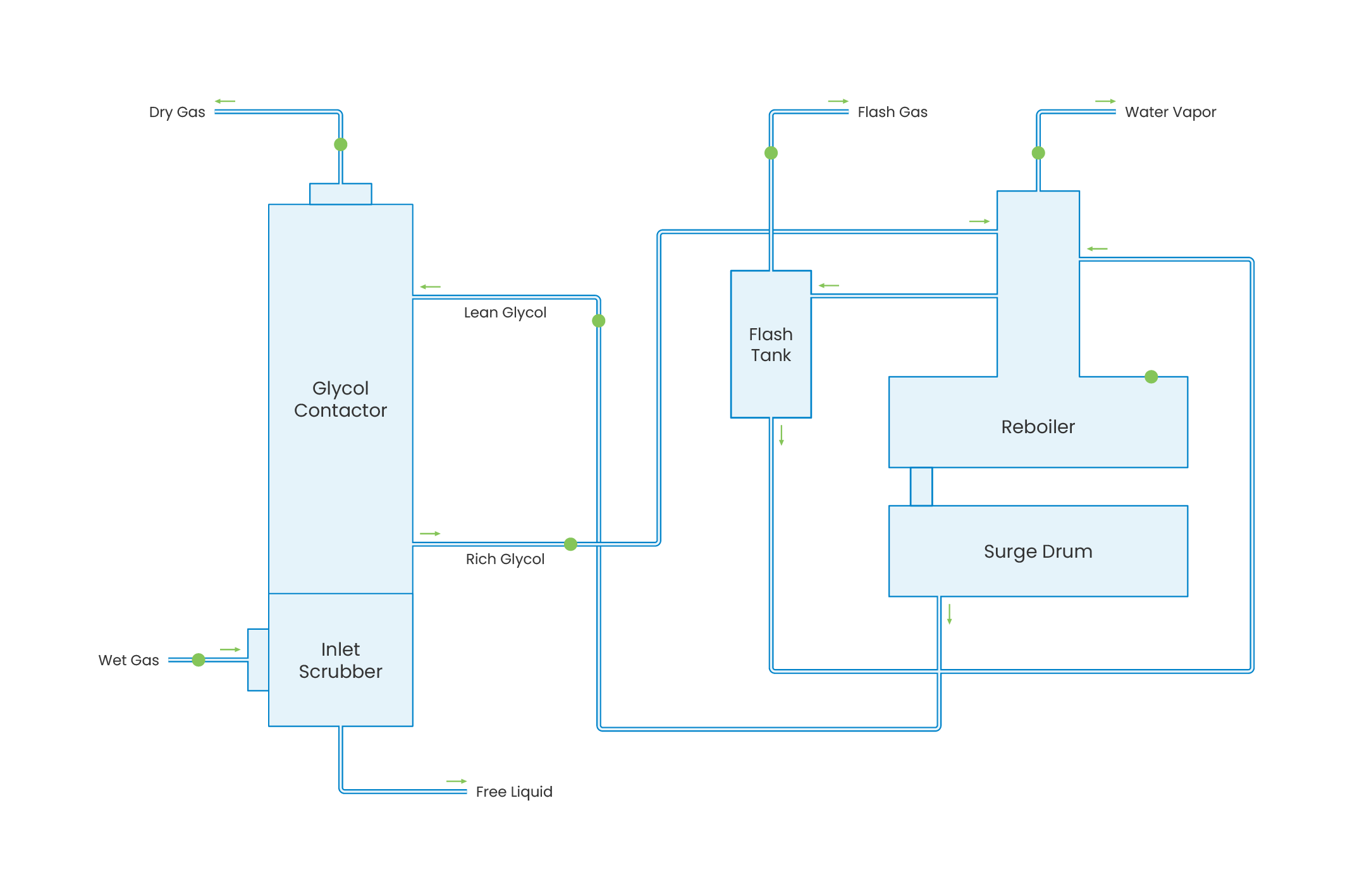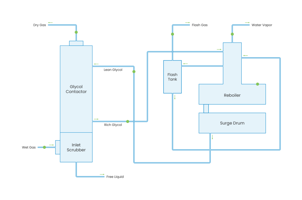 The Dehydration Unit is a critical gas conditioning process in midstream and gas processing facilities, designed to remove water vapor from natural gas to meet pipeline and downstream process specifications. Wet gas enters the glycol contactor, where it flows counter-currently against lean glycol, allowing water vapor to be absorbed from the gas stream. The resulting dry gas is routed to downstream units or export pipelines, while the rich glycol is regenerated through a series of heating and separation steps including flash tank, still column, and reboiler. The regenerated lean glycol is cooled and recycled back to the contactor. Effective dehydration prevents hydrate formation, corrosion, and liquid dropout, ensuring safe gas transportation and reliable operation of downstream units such as LNG, NGL recovery, and cryogenic processes.