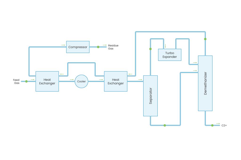 The NGL Recovery Unit is a key midstream gas processing step designed to recover valuable natural gas liquids (NGLs) such as ethane, propane, and heavier hydrocarbons from natural gas. In this process, the feed gas is cooled through heat exchangers and refrigeration, then expanded in a turbo-expander to achieve cryogenic temperatures that condense heavier hydrocarbons. The resulting two-phase stream enters a separator and demethanizer, where methane-rich residue gas is separated and routed to sales gas compression, while the liquid hydrocarbon stream is sent to downstream fractionation for further separation. Efficient NGL recovery improves gas heating value control, maximizes liquid product recovery, and enhances overall plant economics.