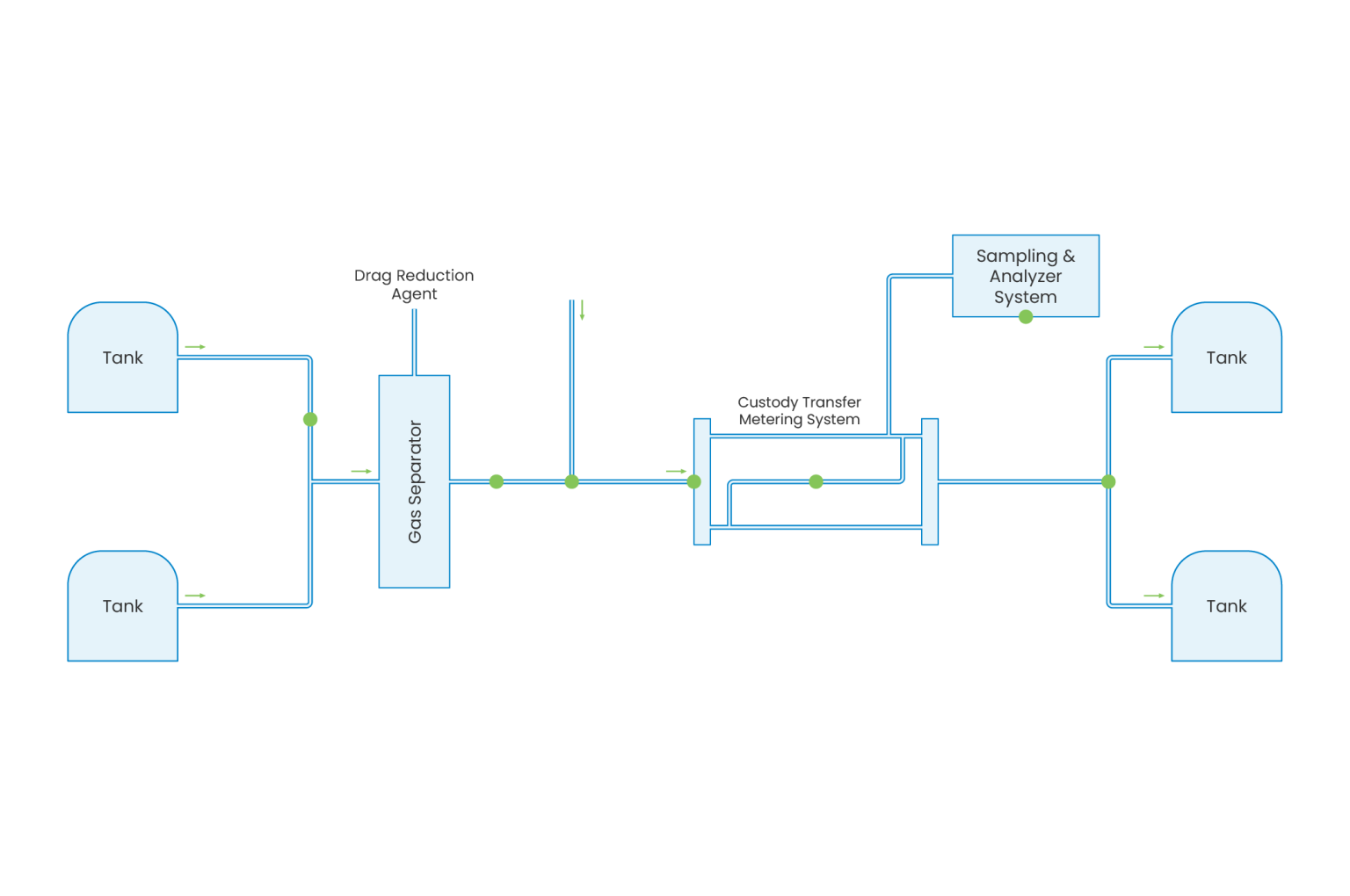 Crude oil and refined product pipeline systems transport liquid hydrocarbons between storage terminals, refineries, blending facilities, and distribution hubs. Product is withdrawn from storage tanks using transfer pumps and routed through a gas separator to remove entrained gas and stabilize the liquid stream. In long-distance transmission pipelines, drag reduction agents may be injected to lower friction losses and improve hydraulic efficiency.